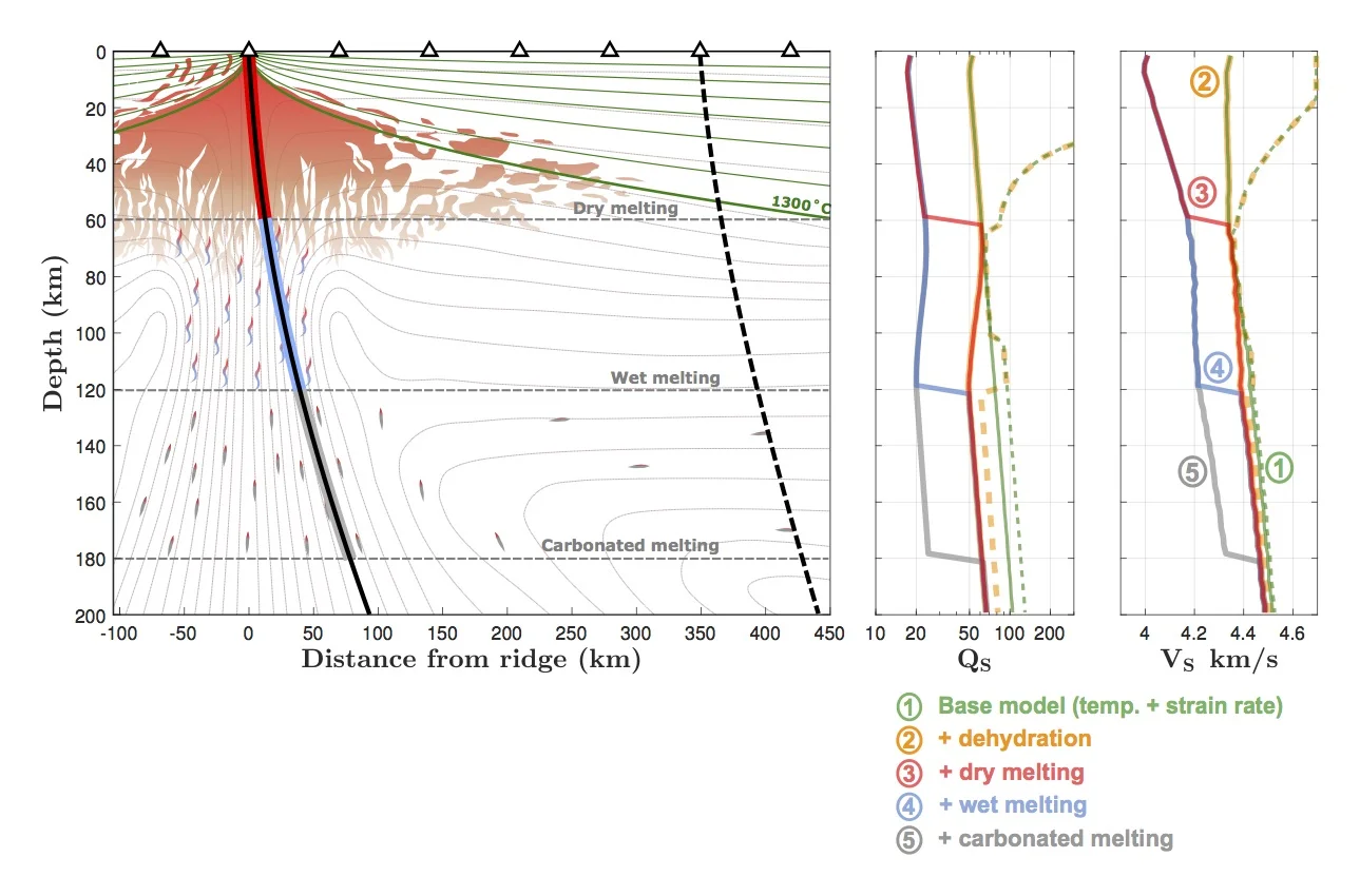 Schematic figure of melt distribution beneath a mid-ocean ridge, and the accompanying Qs and Vs profiles 'seen' by synthetic seismic rays arriving at seismometers on the seafloor.