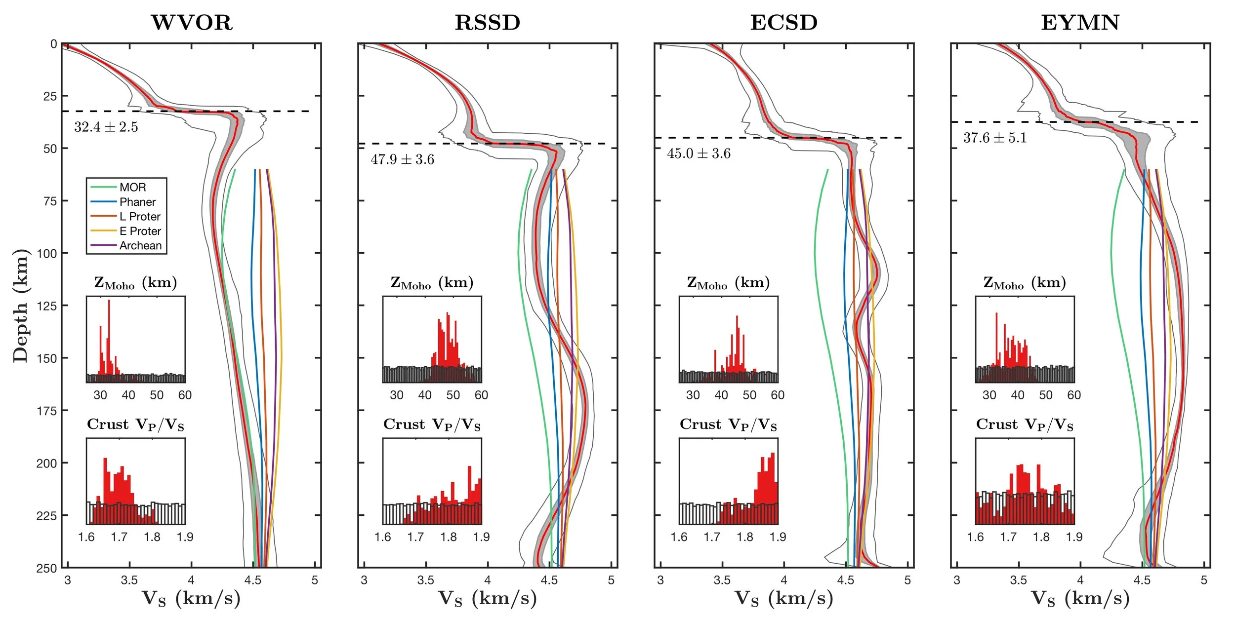 Result of a joint body-surface wave inversion at several stations spanning the northwest to north-central US, from the High Lava Plains to the cratonic interior. This plot shows Vs profiles and histograms of posterior model parameters like the crustal thickness and Vp/Vs ratio.